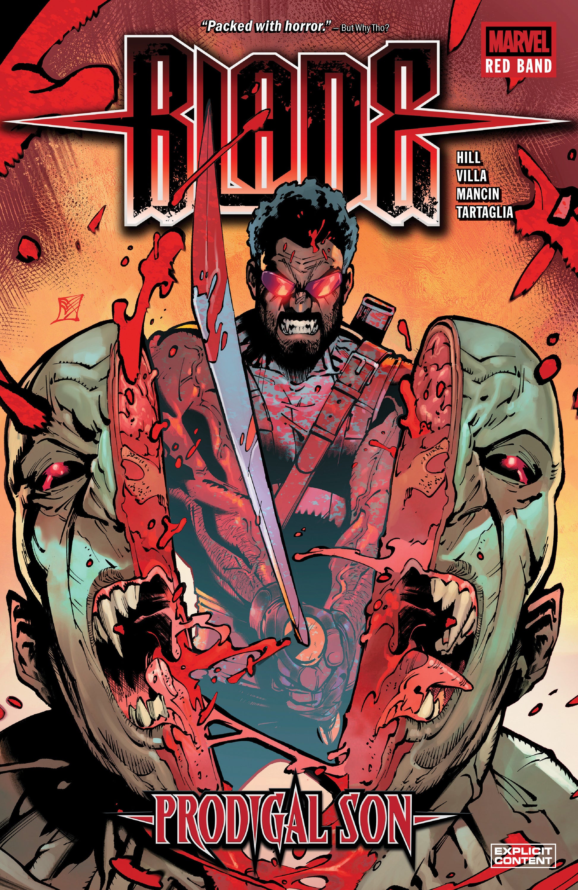 In the wake of blockbuster event BLOOD HUNT, Blade the vampire-slaying vampire finds his life forever changed, in thsi all-new series under Marvel's mature-rated, grindhouse-inspired RED BAND line!NOTE: This special edition is intended for mature audiences only.For years, Blade has been the deadliest vampire hunter in the Marvel Universe! With an arsenal of wooden stakes, silver bullets and razor bats at his command, few have known the taste of vengeance and blood like him! But after the harrowing events of BLOOD HUNT, what’s left of the Daywalker? Did any of the vampire within Blade survive? Did any of the man? He may want more than ever to be left alone — but the world, and danger, won’t let him go, and he soon finds himself embroiled in conflict with his bloodlust reignited! Can Blade escape the crosshairs of the latest in the famous lineage of Van Helsing?! Perhaps with help from his new partner!COLLECTING: Blade: Red Band (2024) 1-5